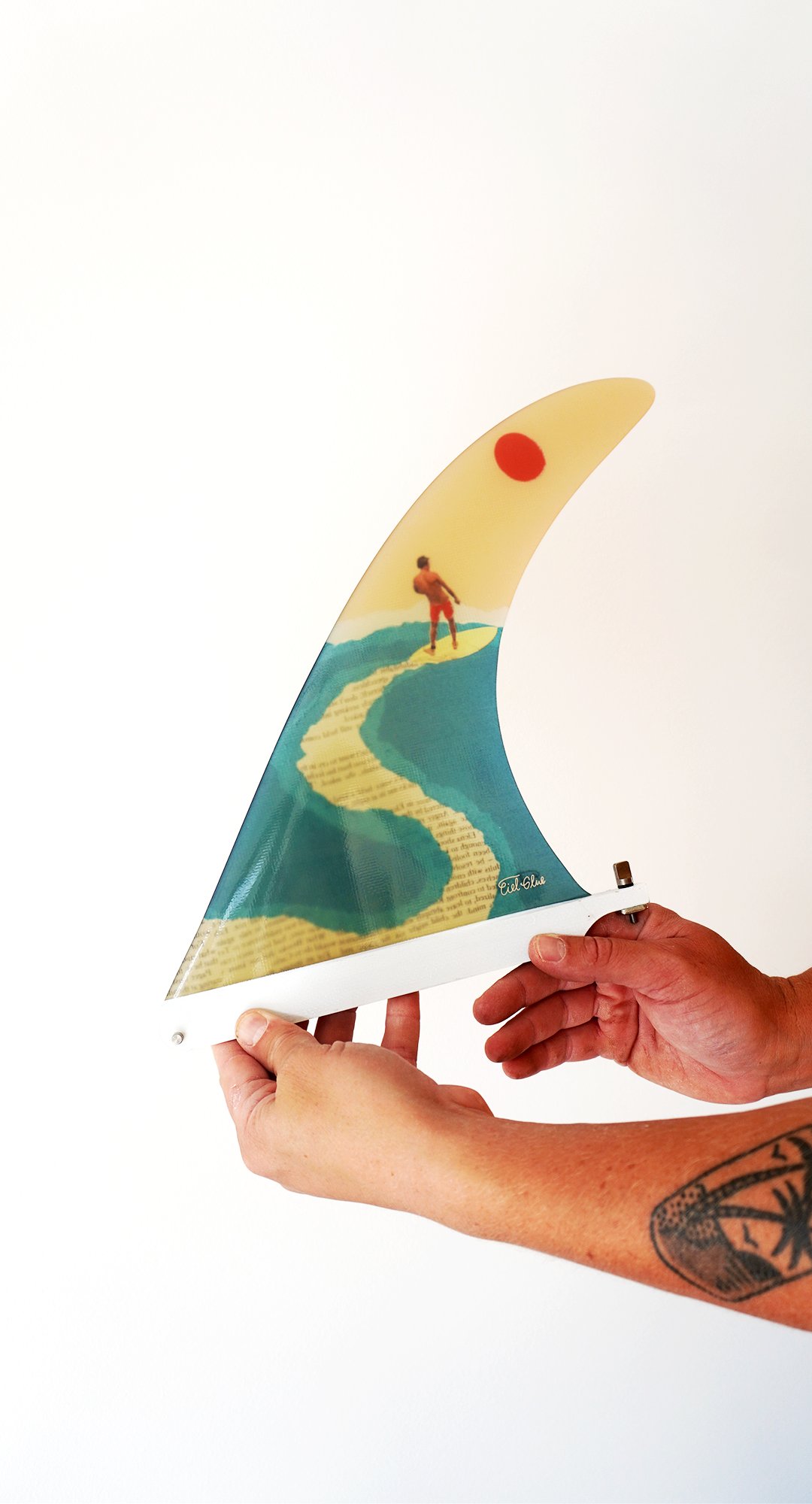 This collaboration with Deflow transforms a surf fin into a piece of art. Inspired by collage, the design features two surfers interacting with each other, made entirely from ocean-themed text and materials. In this artwork, the surfers are literally “reading the wave”, merging creativity with the spirit of surfing.